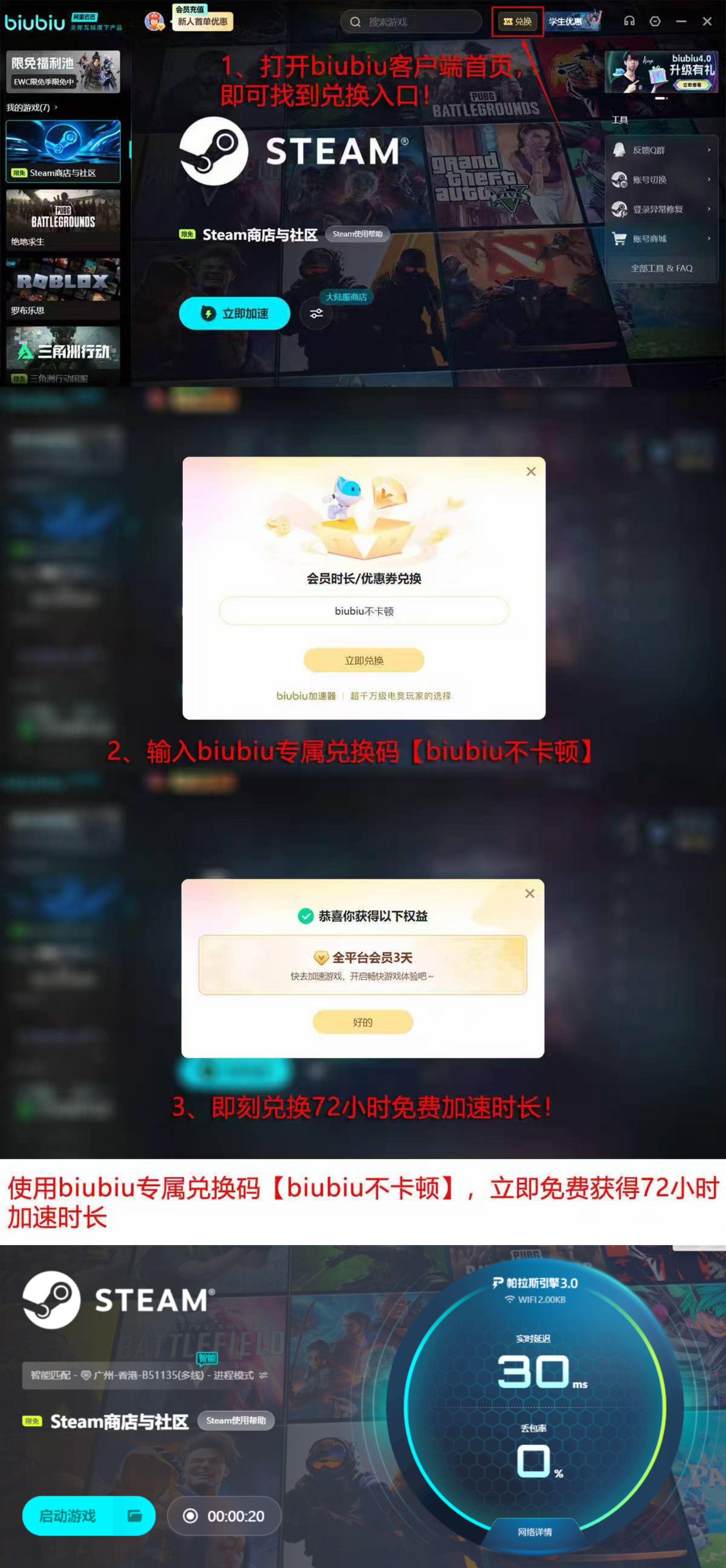 新用户可零门槛试用:完成首次注册即可获得24小时全功能免费加速时长。建议优先测试常玩的几款主流网游,直观感受延迟下降、操作响应提速、画面流畅度提升等变化。此外,输入兑换码【biubiu不卡顿】,还可额外领取3天连续加速权益。总计4天的完整体验周期,足以覆盖多场景、多时段、多设备下的实际使用验证——效果不理想无需付费,无任何隐性成本。