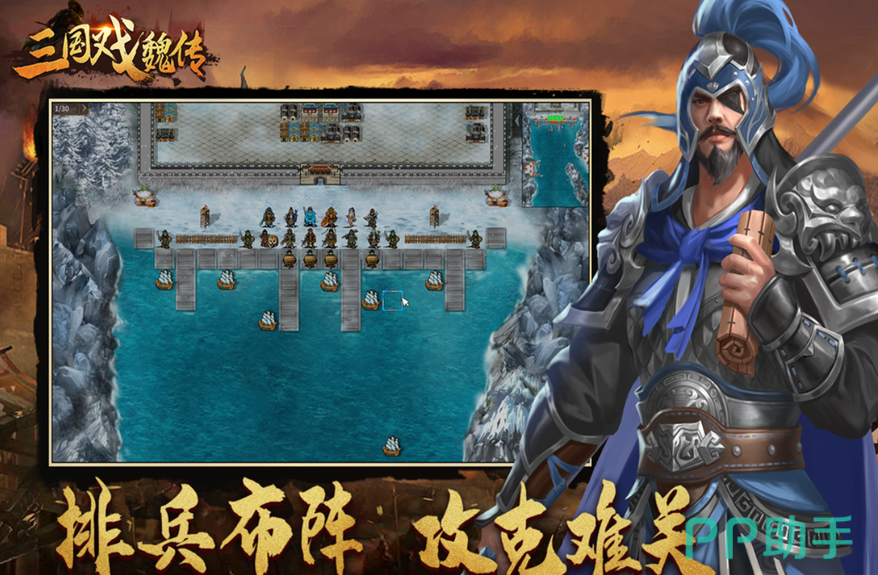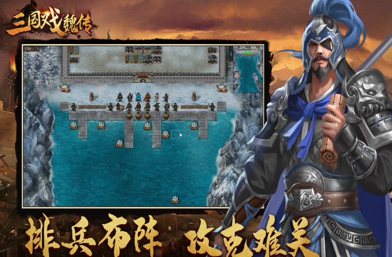 《三国戏魏传》是一款数值驱动的战棋类单机策略游戏,融合CCG(集换式卡牌)逻辑与六边形网格战场。玩家需部署武将与兵种单位,在巨型像素地图上展开回合制对抗。胜负取决于属性计算、地形加成与阵型搭配,强调战术预判与资源分配。游戏完整收录魏国核心将领及官渡、赤壁等标志性战役场景,历史还原度高,策略深度充足。