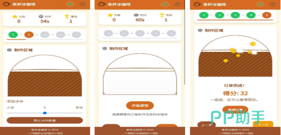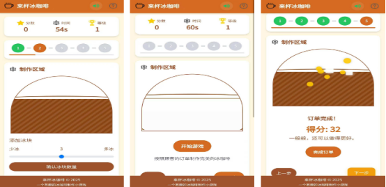 本作主打轻量化交互设计,界面简洁明了,所有操作按钮与提示信息均直观呈现于屏幕固定区域。制作流程高度可视化:例如在冰饮环节,系统会明确标注“加冰”“去冰”或“少冰”等指令,玩家只需按提示完成对应步骤即可。虽无复杂机制,但限时制作机制有效锻炼玩家的专注力与时间分配能力,适合全年龄段入门体验。