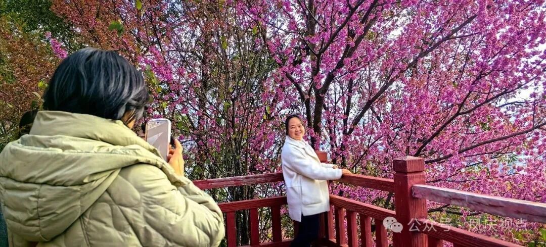 樱花树下,年轻人也专程寻花而来,“打卡”留影,用镜头记录下这缤纷的风景。有的架起手机开启直播,将这份冬日限定的浪漫实时分享给远方亲友。还有不少家庭带着孩子前来,孩子们在花下追逐嬉戏,欢声笑语与粉末红艳交织成一幅温馨和谐的生活图景。