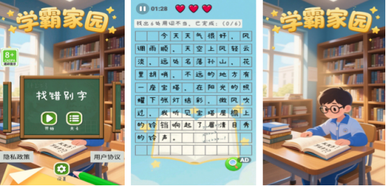 聚焦语言应用能力训练,以修改学生作文为任务主线。每篇文本均预设6处典型语病或错别字,类型覆盖用词不当、搭配错误、同音混淆、标点误用等常见问题。关卡设置限时机制,要求玩家在规定时间内完成全部修正,强化快速识别与精准判断能力。