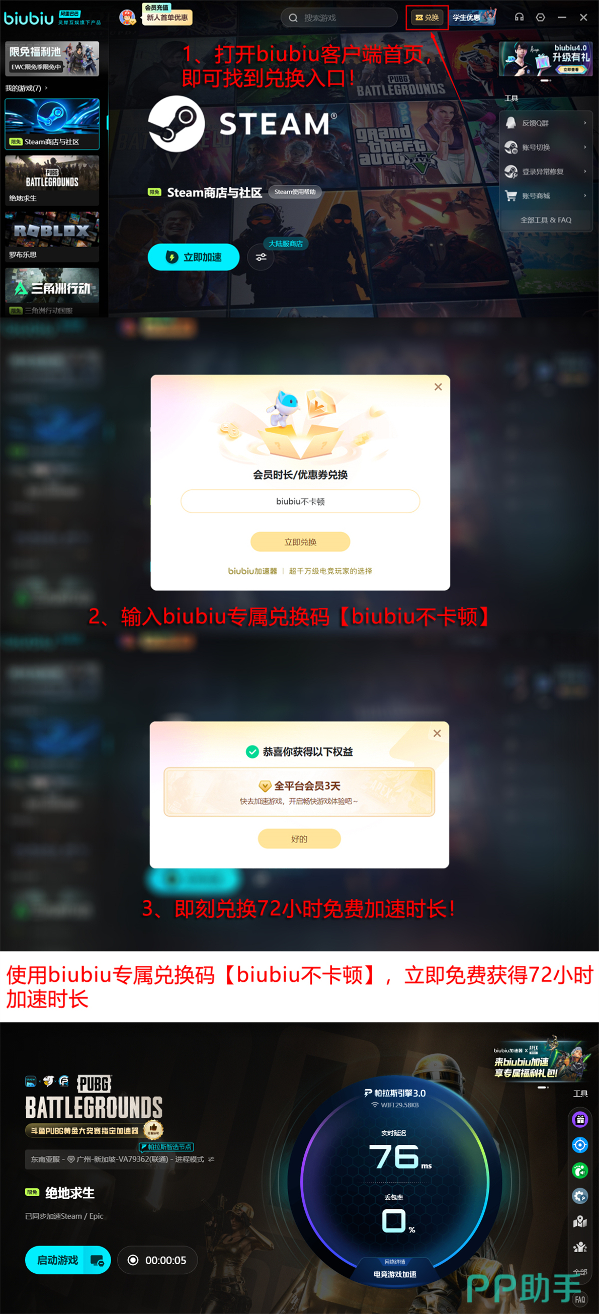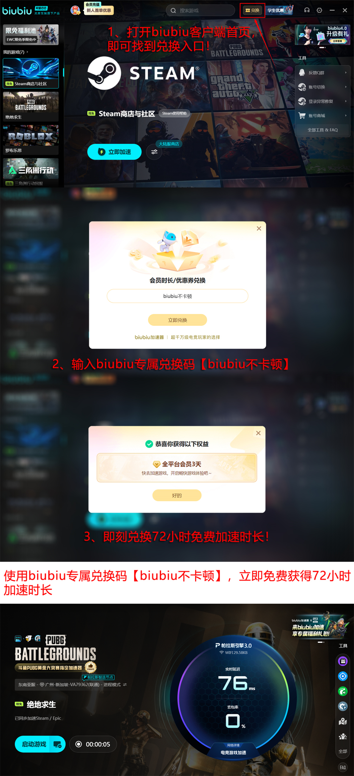 考虑到用户对实际效果的关注,biubiu提供无门槛试用机制:新注册用户可立即获得24小时全功能免费加速权限,无需绑定支付方式。同时,平台发放通用兑换码【biubiu不卡顿】,每位账号限用一次,激活后可额外获取72小时加速时长。新用户叠加权益总计可达96小时,完全满足多日连续使用需求,便于充分验证加速稳定性与兼容表现。