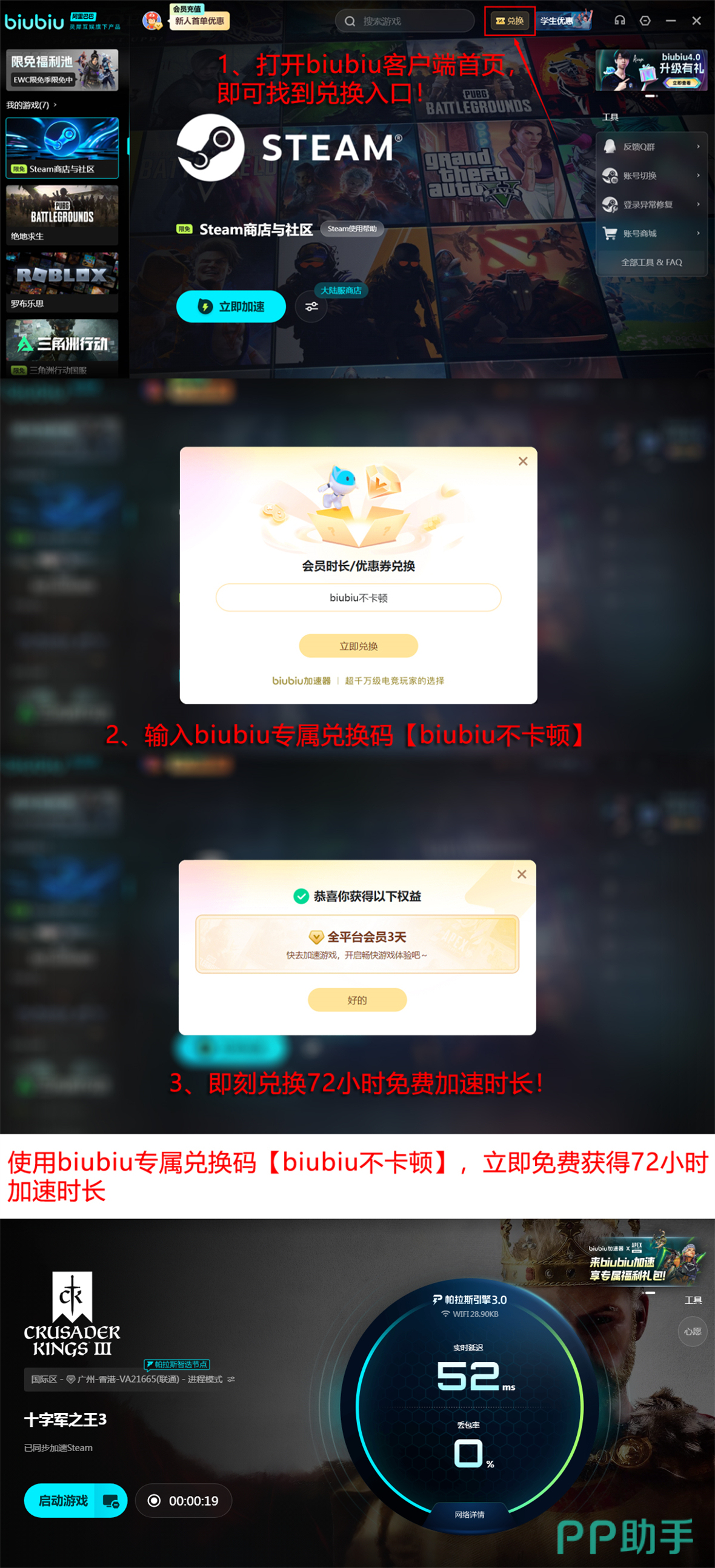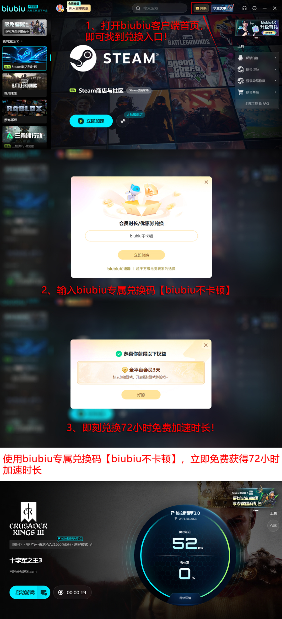当前biubiu加速器面向新用户提供双重福利支持:注册后可直接领取24小时免费加速时长;另附通用兑换码【biubiu不卡顿】,每个账号限用一次,可额外兑换72小时服务。两者叠加使用,总计可获得96小时无门槛加速体验,适用于包括CK3在内的多款策略类大作。