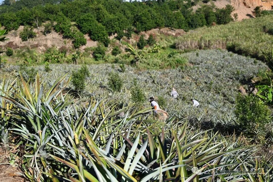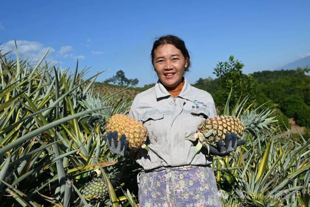 这融融暖意背后,是农户们日复一日地深耕。上帮瓦村民小组的番老五与妻子沙麻波,就在这片菠萝地里,用十余年的光阴,种出了踏实稳当的生活。从最初几亩薄田起步,浇水、施肥、除草、防虫……每一步都认真对待。雪梨村土地肥沃、光照充足,恰合菠萝脾性,夫妻俩凭着韧劲,把地越种越活。如今,四十余亩的菠萝园在山间舒展,每一株抽叶挂果,都浸透了他们早出晚归的汗水。