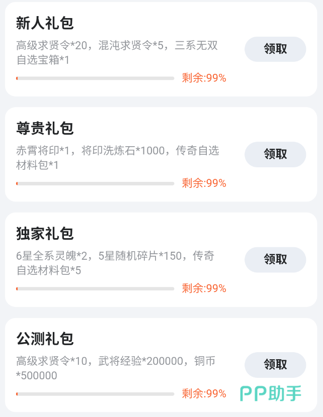 上面这个福利是全平台的,但福利还没完呢!九游app还有专属的新人礼包、尊贵礼包、独家礼包、公测礼包,内涵超多求贤令,也就抽卡券,甚至还有三系无双自选箱,赤霄将印、5星随机碎片等珍惜材料。这些礼包是限量的哦,现在余量充足,大家抓紧时间冲!
