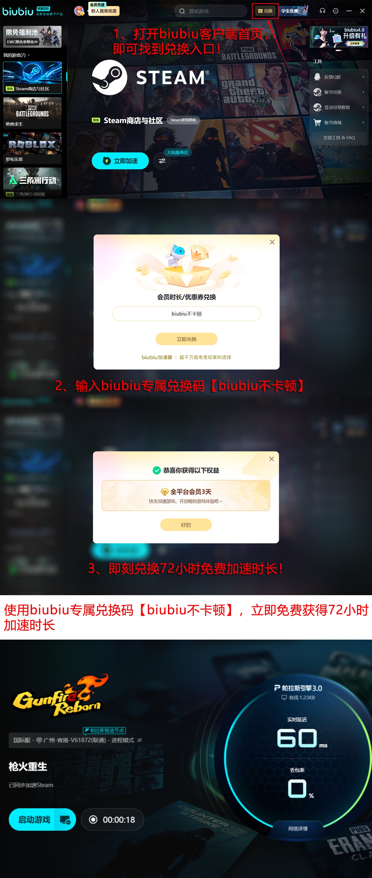 关于服务成本,平台推行透明化策略:新用户完成首次注册即可激活24小时全功能免费试用权限;试用结束后,无论新老用户均可凭专属兑换码【biubiu不卡顿】额外领取72小时加速时长。综合计算,新用户初始可用周期达96小时,支持不限次数、不限游戏的一键加速操作,大幅降低试错成本,规避非适配加速工具带来的无效支出风险。