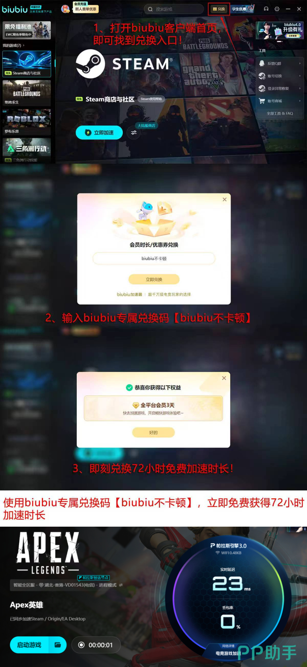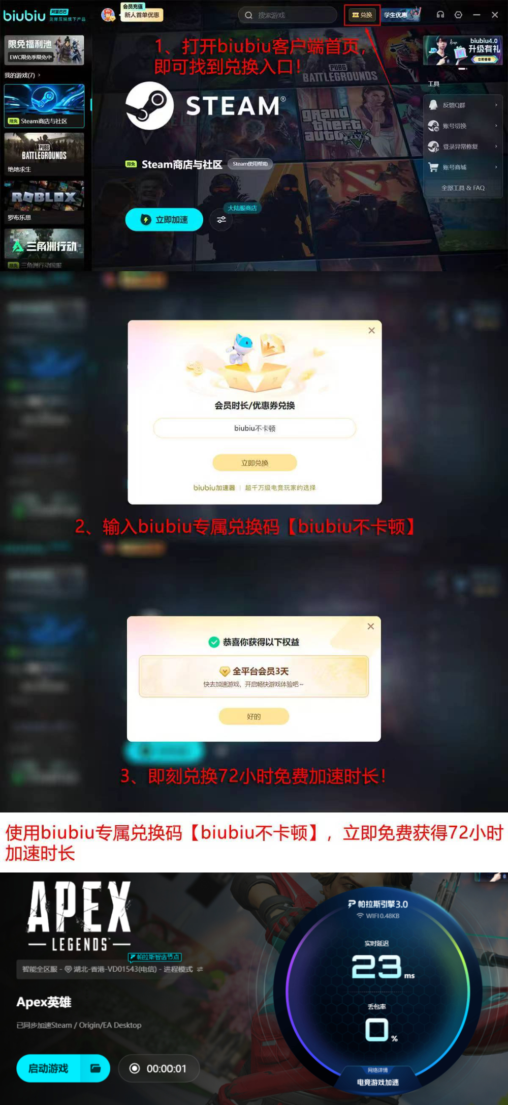 尚未使用过的用户可立即注册,享受首次开通即赠的24小时全功能免费加速权益,无需预存、无需绑定支付方式,零门槛体验稳定连接效果。新用户还可通过输入专属兑换码【biubiu不卡顿】额外领取3天加速时长,合计可获得连续4天的完整服务体验。若实际使用中未达预期,随时可终止,无任何隐性限制或费用产生。