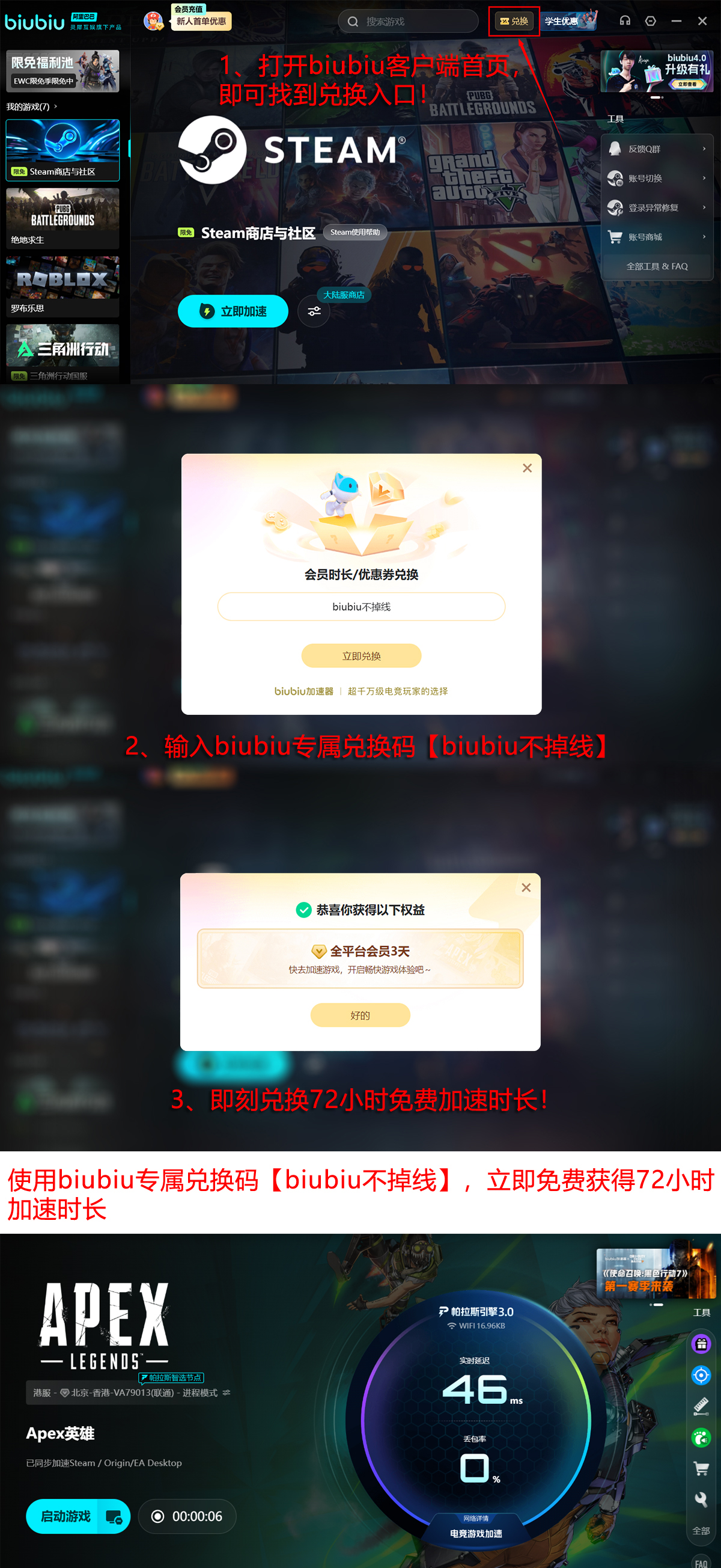 新用户完成注册并激活账户后,可立即获得首个自然日24小时全功能免费试用权限。输入专属口令【biubiu不掉线】,还可额外延长72小时专业加速服务,累计享受长达96小时的无感网络优化体验。