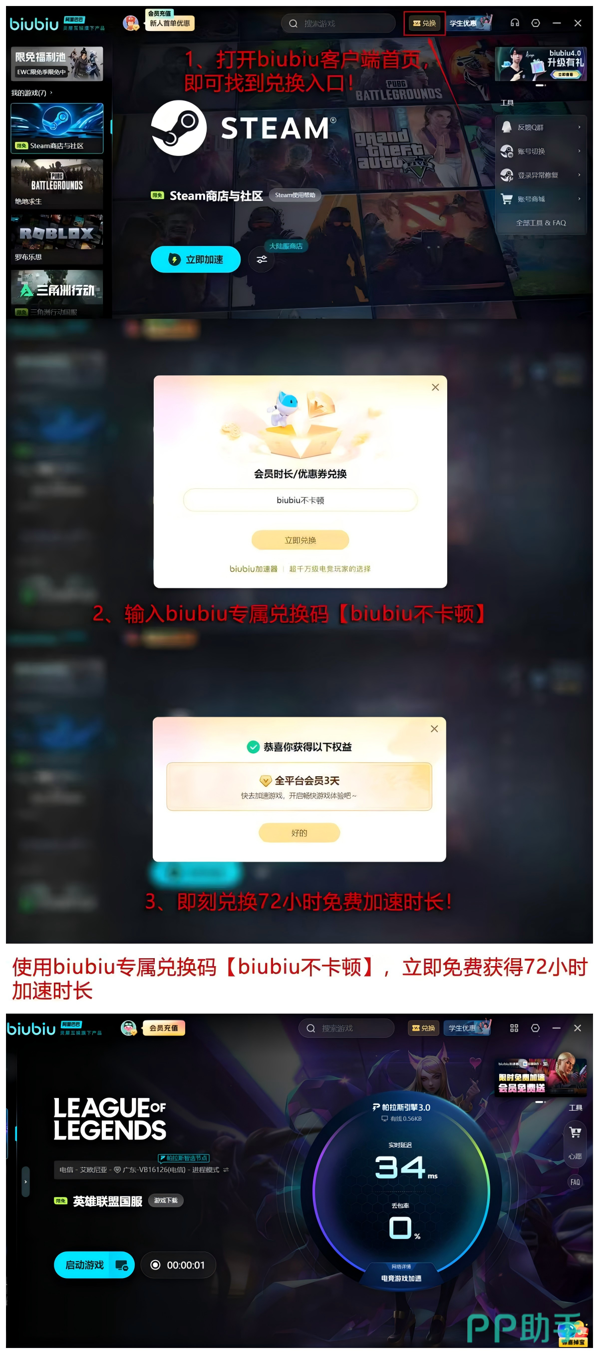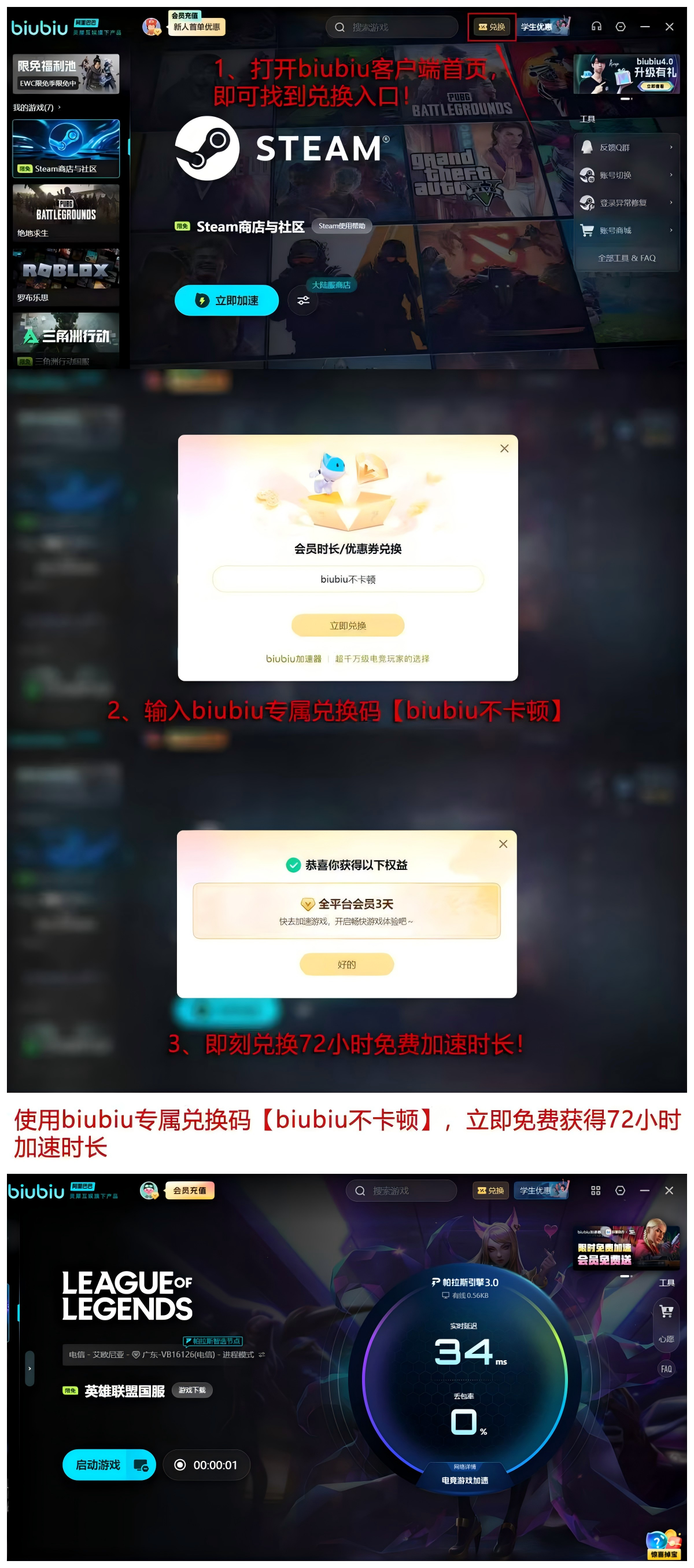 【biubiu不卡顿】支持连续加速72小时,新用户首单即赠24小时权益,累计达96小时可用时长,所有加速时段均可分段使用,未兑换口令前永久保留,灵活适配各类对战节奏与上线计划。