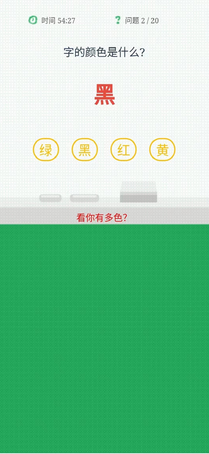 本作聚焦色彩识别能力强化,采用经典的斯特鲁普效应(Stroop Effect)原理设计关卡:文字内容与字体颜色不一致,要求用户主动抑制语义干扰,仅依据色相完成判断。内置普通与困难双难度体系,支持渐进式强度调节;高对比度配色方案有效激活视网膜锥细胞响应,特别适用于提升弱视眼的色彩分辨阈值与视觉选择性注意水平。单局时长约2–3分钟,契合碎片化训练场景。
