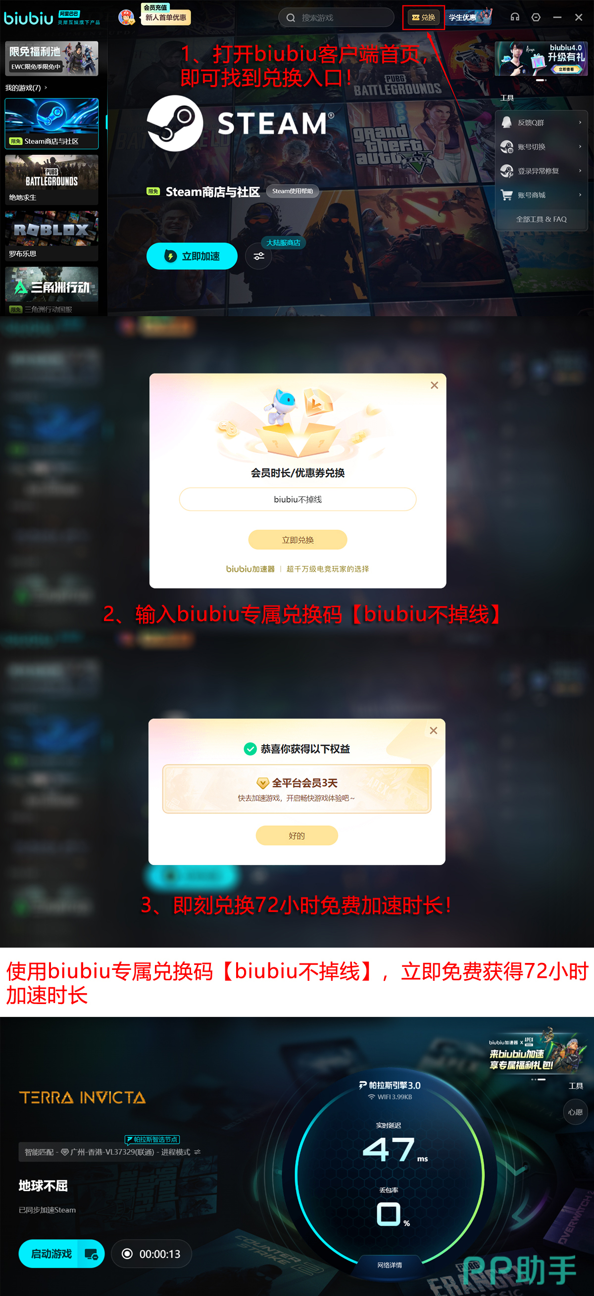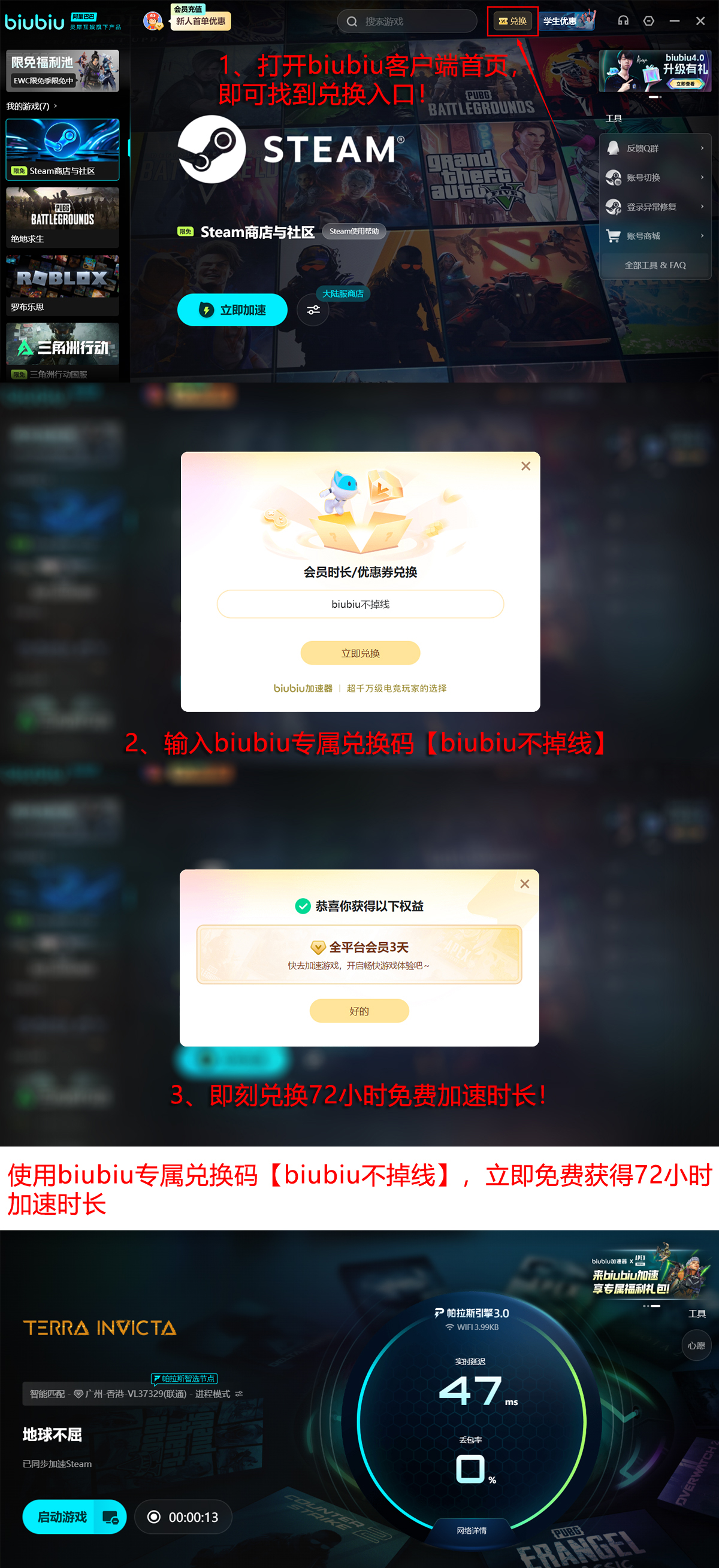 立即开启高效体验:新用户注册即可获赠24小时免费加速服务;输入专属激活码【biubiu不掉线】,还可额外领取72小时加速时长。新老权益叠加后,总计96小时连续可用,足以支撑多轮完整战役周期。此外,请留意biubiu平台定期推出的限免活动,Steam等主流数字平台常同步上线福利资源,合理利用可进一步降低体验成本。