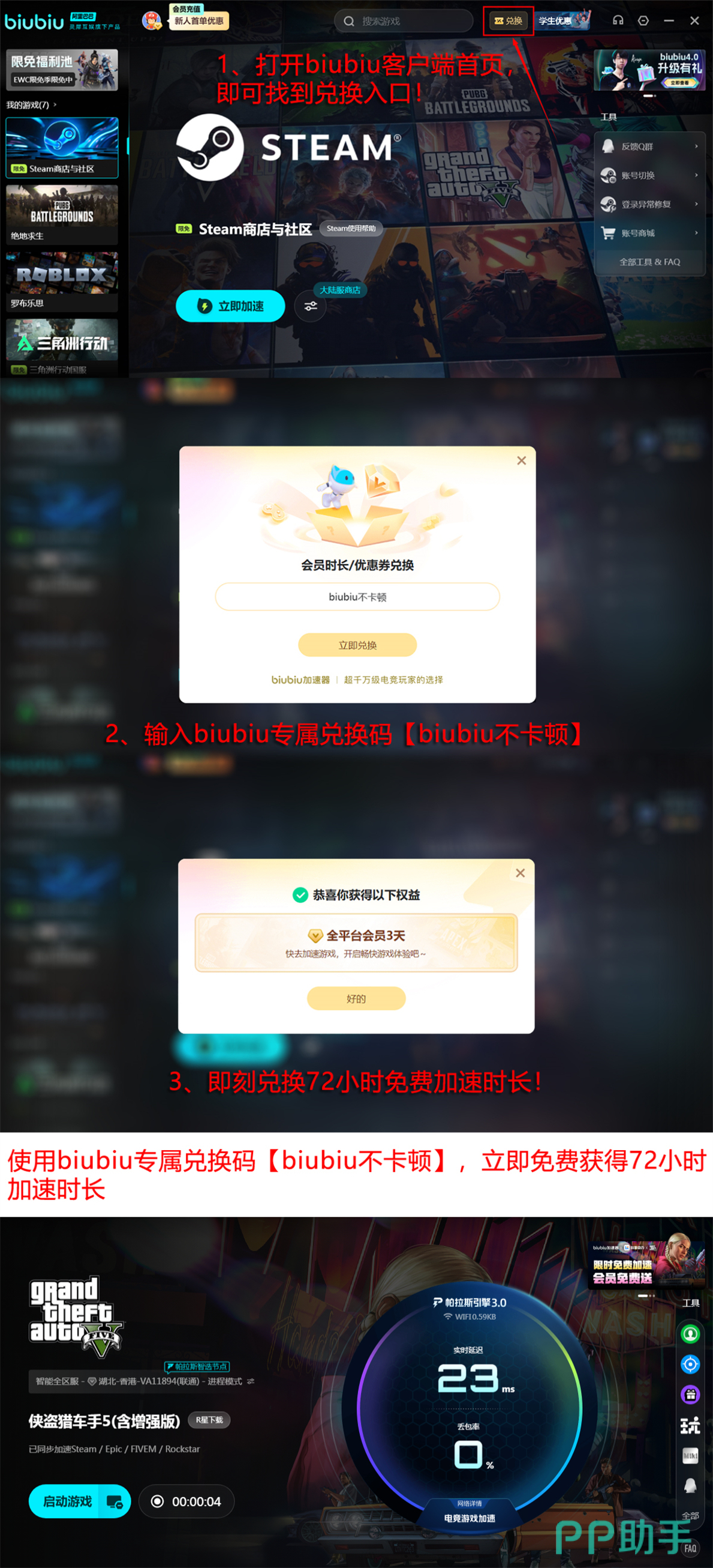 在用户权益方面,biubiu提供阶梯式体验机制:新注册用户可立即获得24小时全游戏免费加速权限;另附专属兑换码【biubiu不卡顿】,每个账号限用一次,激活后享72小时连续加速服务,充分验证实际效果。后续充值支持首充特惠,叠加活动发放的通用代金券,进一步降低使用成本。