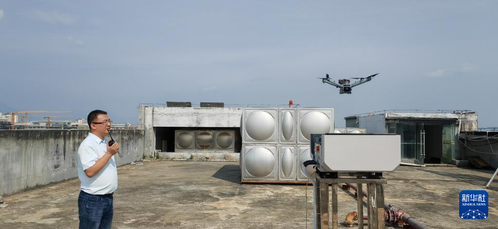 在蒙自市城区的一处楼顶,工作人员正在指挥远程操控无人机。新华社记者浦超 摄