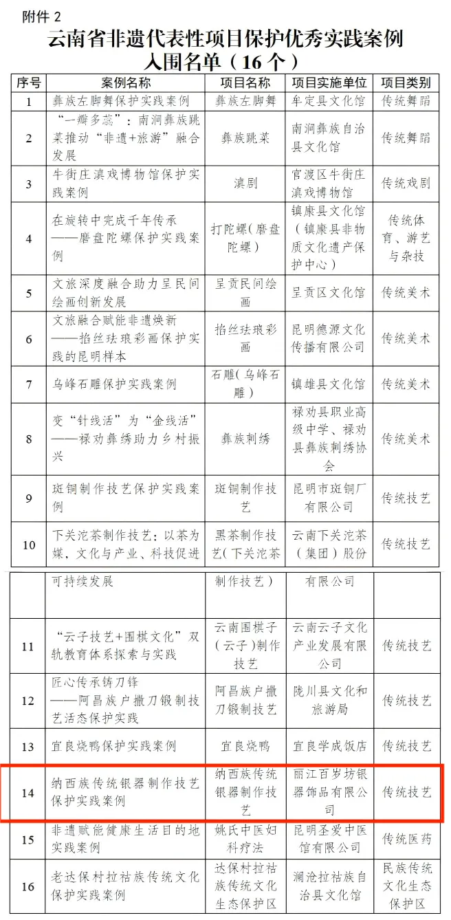 云南网讯(记者 龙彦)近日,云南省非物质文化遗产保护中心发布2025年“云南省非遗代表性项目保护优秀实践案例”入围名单,其中,丽江百岁坊银器饰品有限公司推送的“纳西族传统银器制作技艺”成功入选。