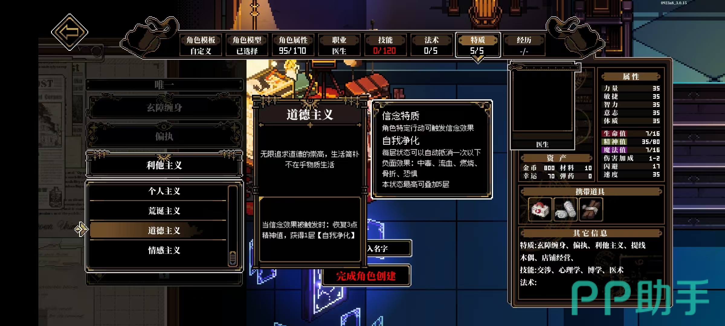 还有剧情或模组特质,是通过特定选择和任务获取到的,例如懵懂恋情,在图书馆和艾米互动之后解锁,会影响后续的社交判定。还有异化魔种,需要完成谎言与欺诈模组中的教堂仪式流程,涉及到隐藏互动和圣灵药的使用。再例如接触邪教,降低精神上限,但提升博学判定,适合知识流的角色选择。