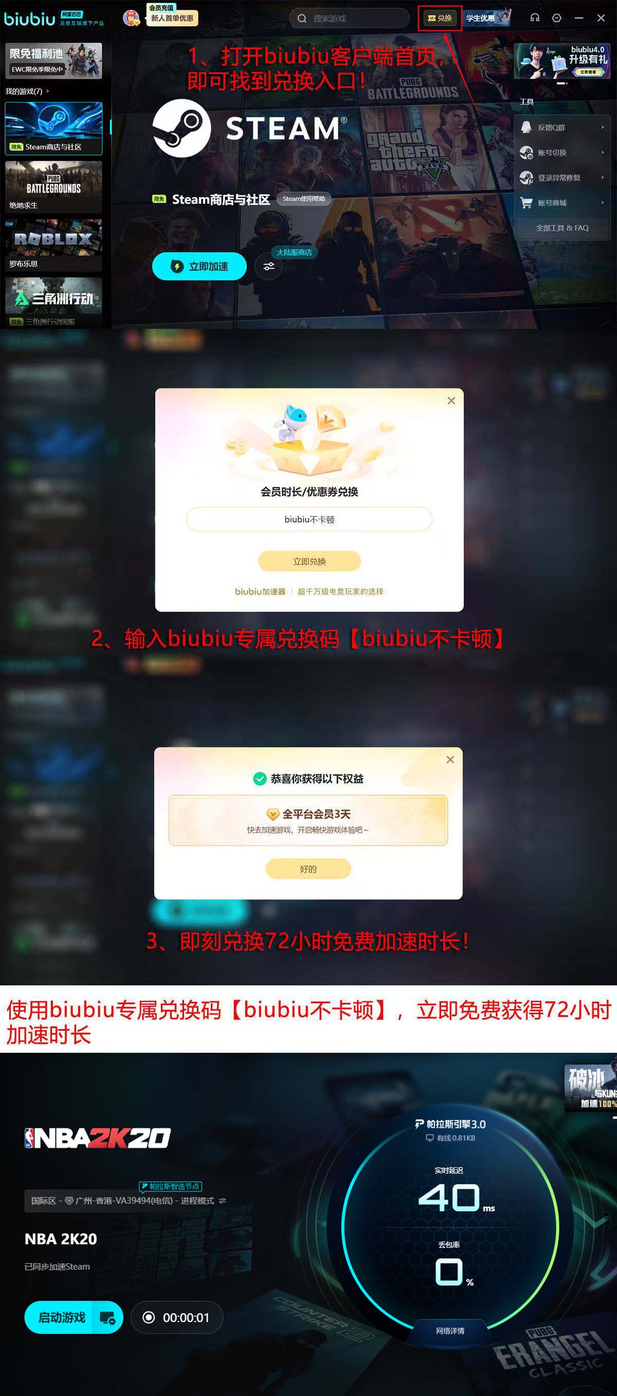 新用户现可享双重限时福利:完成注册即赠24小时加速时长(自动发放),另可通过客户端首页“兑换”入口输入口令【biubiu不卡顿】领取3天使用权,两项叠加共96小时免费体验期,时间可连续使用。