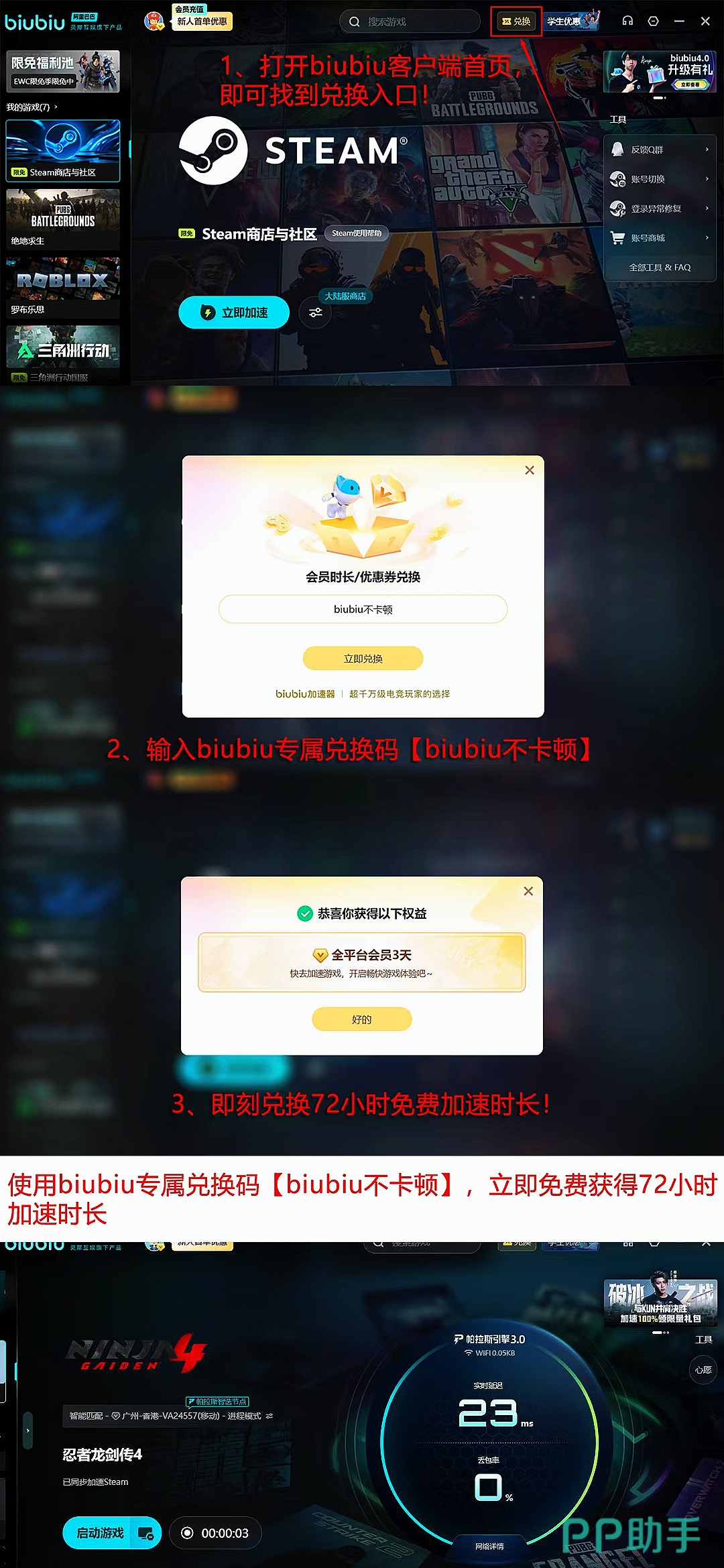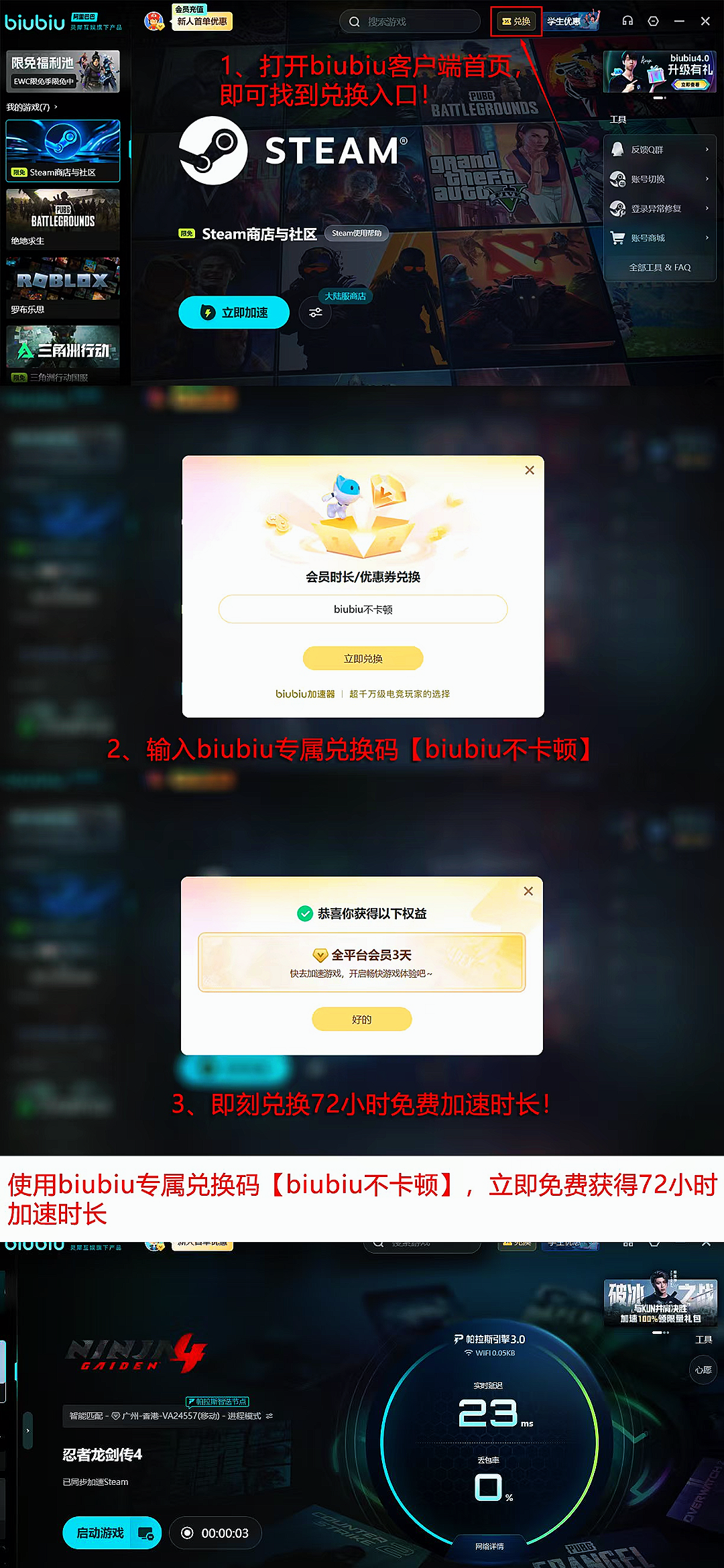 在性能升级的同时,biubiu对于新用户的服务也是无微不至的,只要是新用户注册biubiu都可以获得24小时免费加速,在免费加速期间任意游戏都可以加速,并且新老用户使用兑换码【biubiu不卡顿】可获3天免费的使用权哦!