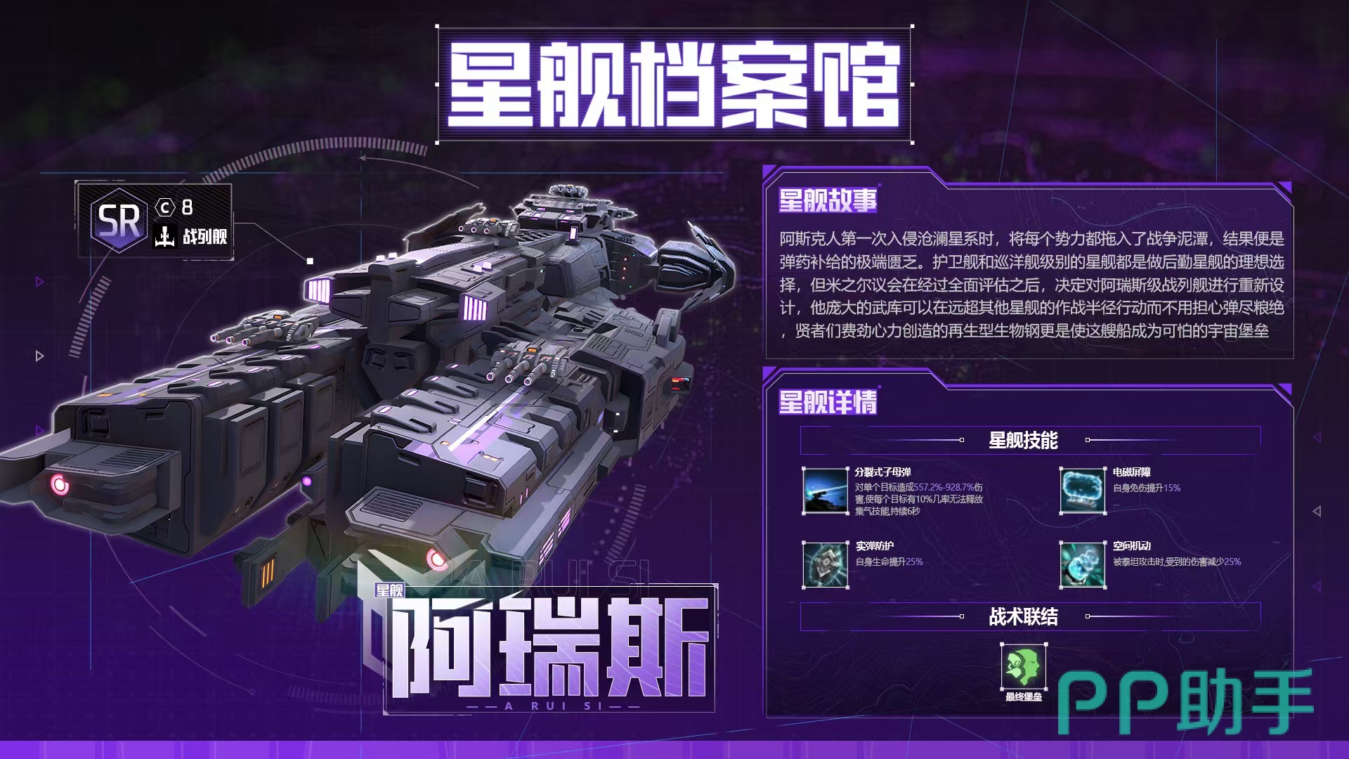 在经过米尔议会全面评估之后,阿瑞斯战列舰进行重新设计,拥有再生型的生物钢,使这款钢铁战舰成为更可怕的宇宙堡垒。自身技能一共有四个,第一个分裂式子母弹,可对单个目标造成高额伤害,使每个目标都有几率无法释放集气技能,持续6秒钟。