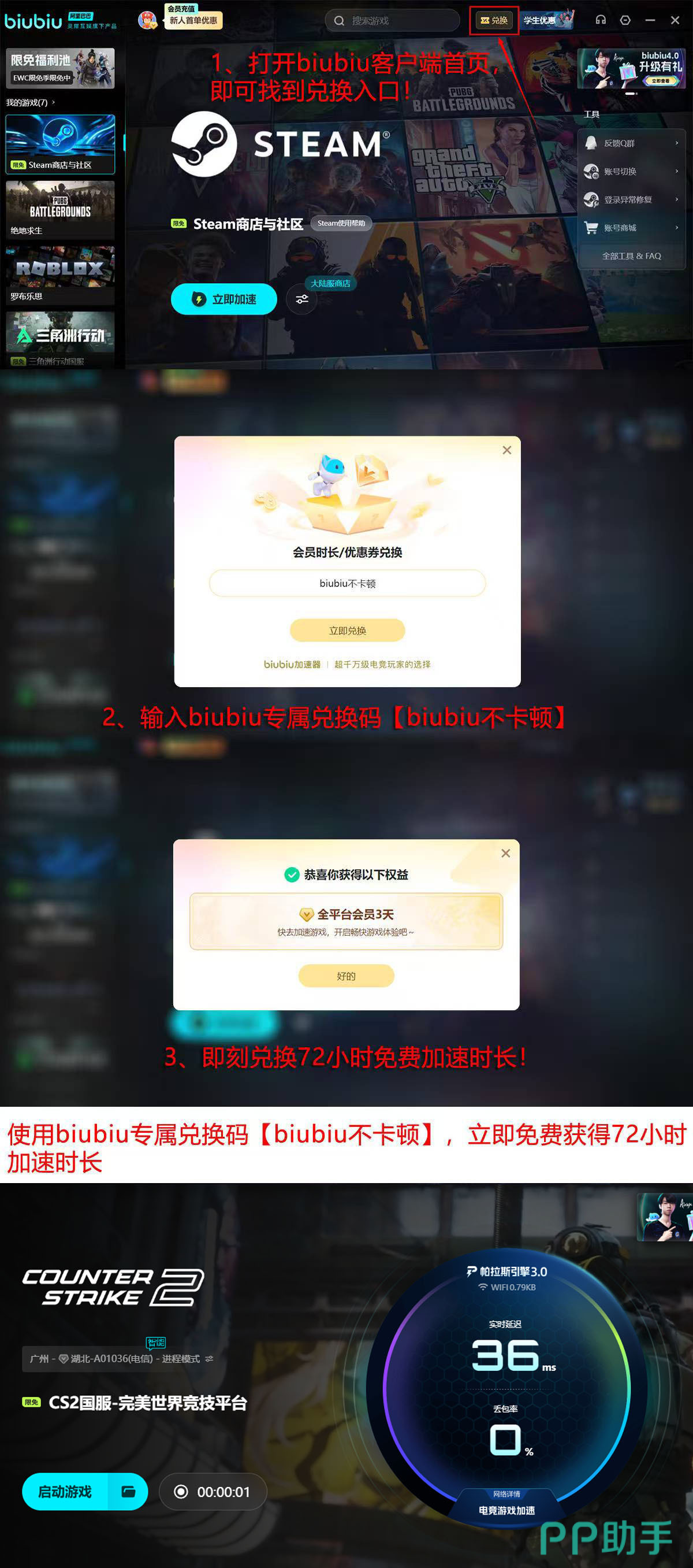 实际应用效果显示:启用biubiu加速器后,CSGO客户端崩溃率下降约76%,复杂地图(如Dust2、Inferno)下多角色同屏交火时的操作响应延迟趋近于本地输入,有效避免因网络抖动导致的“开枪未命中”或“跳跃中断”等误判。为便于用户评估效果,平台提供双重免费试用权益:新用户注册即赠24小时全功能使用权;登录客户端后进入“兑换”页面,输入口令【biubiu不卡顿】,可额外领取72小时加速时长,两项叠加总计96小时,且支持跨设备共享使用。