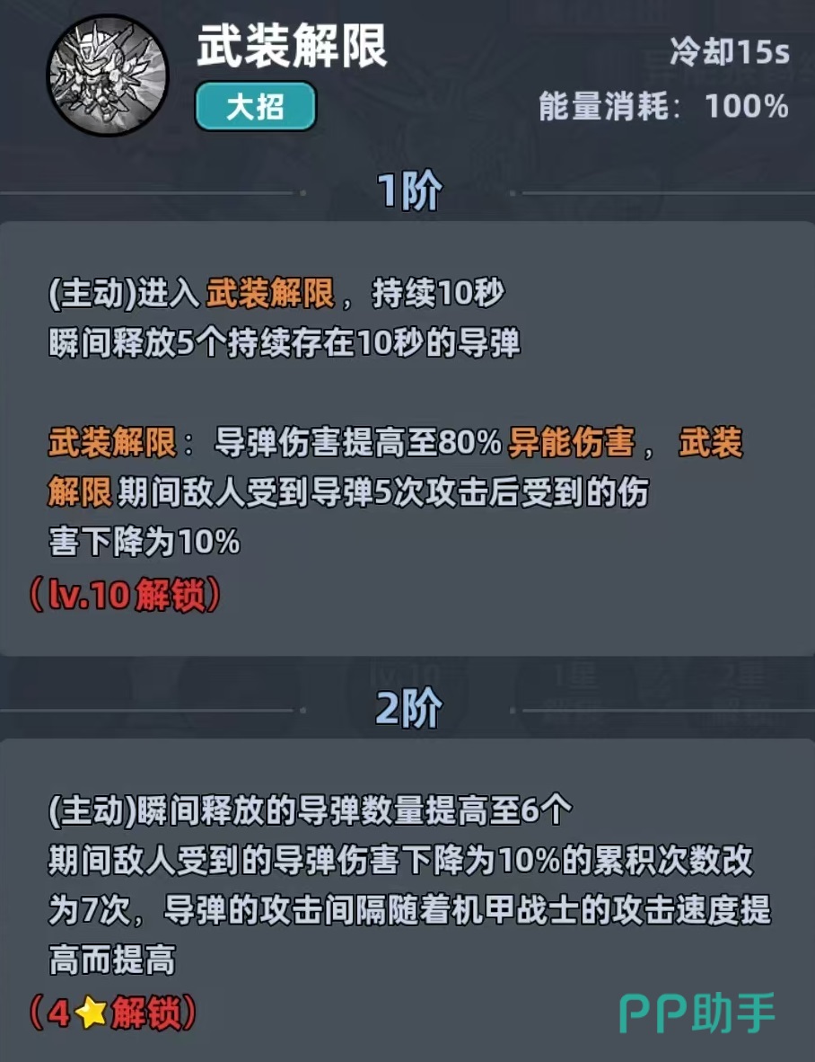 大招释放之后进入武装解限状态,瞬间可释放5个持续存在的导弹,在武装解限状态下,导弹的伤害提升。也正是因为这样的特点,所以他在前期开荒和中期过渡过程中非常强势,只不过在后期输出略有乏力,不过可以作为前期主C,后期转换成副C,这样根本不会浪费。在使用的时候应该优先提升攻击属性,接下来才是最终增伤、追击率和暴击以及攻速。主要都是围绕着提升脱手伤害和破防去堆。培养过的时候优先升到三星,可以解锁额外的追击加成,使得清场的效率变得更高。因为这个角色最强的能力就是在于清场快,适合中期过度,是很多微氪玩家开荒的首选。