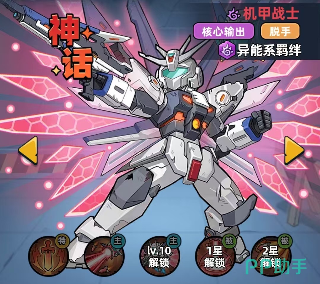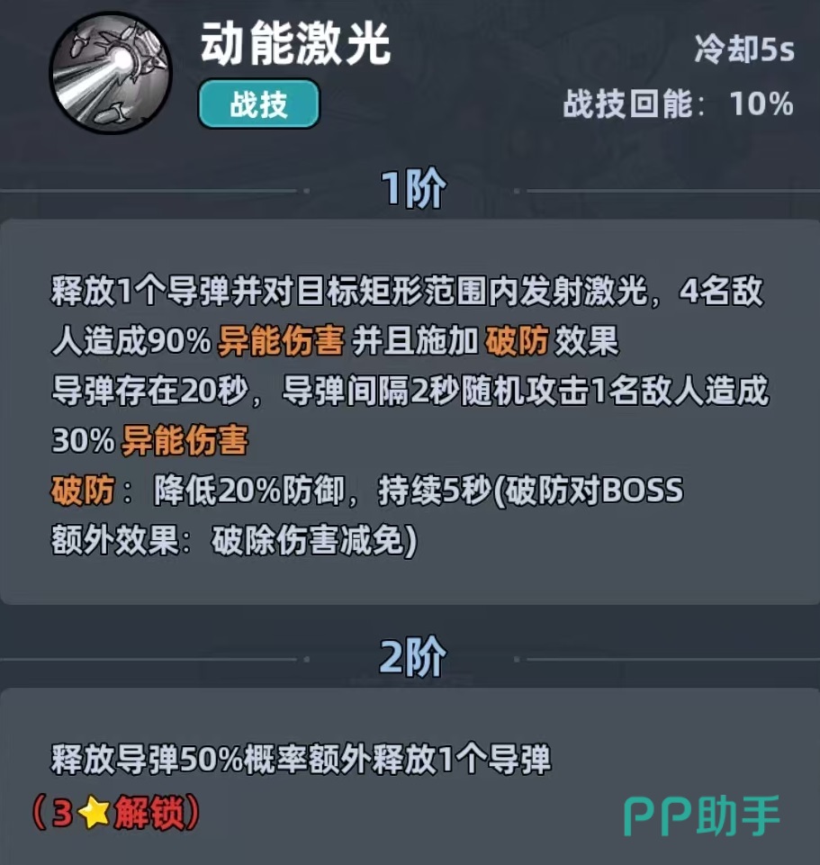 这款游戏各个角色特点在九游专区中都可以直接查看到,九游是当前手游福利性价比最强的APP,且自身属于阿里巴巴灵犀互娱大厂旗下,各个方面都很有保障,是大家下载玩游戏的最佳选择。机甲战士是属于游戏中的异能队的主c和辅c人选,依靠脱手导弹和激光,可以打出高频率的群伤。自身获取途径也比较多,所以新手玩家也能拿来直接上手。主动技能动能激光,释放导弹对目标范围内造成异能伤害并施加破防效果,破防可降低对方防御,提升队友的输出。释放导弹之后还可以存在20秒钟,每隔2秒就可以随机攻击一个敌人。