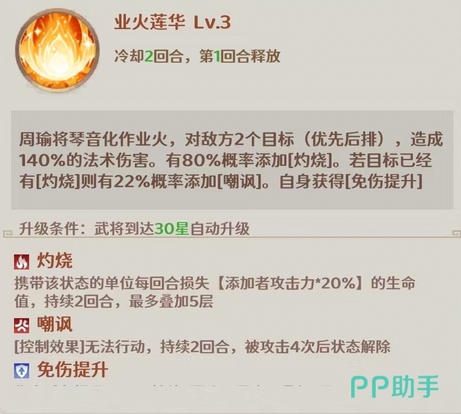 灼烧是属于游戏中最重要的异常状态之一,对方被灼烧后会按照施法者攻击力的20%掉血,最多能叠加到5层。叠加起来之后仅仅是灼烧伤害就很可观。嘲讽效果是对方无法行动,在被攻击四次之后才会解除该状态。免伤提升带来的是10%伤害减免,可以叠加三层。大招是攻击敌方全体,造成法术伤害后,目标身上的每层灼烧都可以提升10%的暴击率,最多提升30%,如果目标身上挂着嘲讽,则本次伤害提升40%暴击伤害。另外还有两个被动,进入战斗后提高自身伤害,回合结束时对随机目标造成真实伤害。战斗开始时就有90%的几率对随机目标添加灼烧。