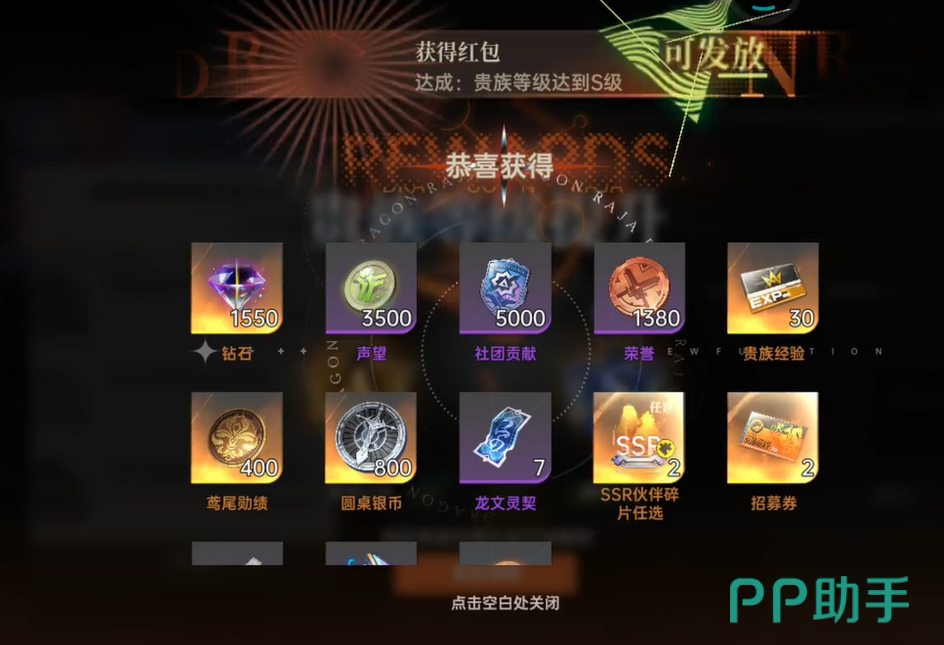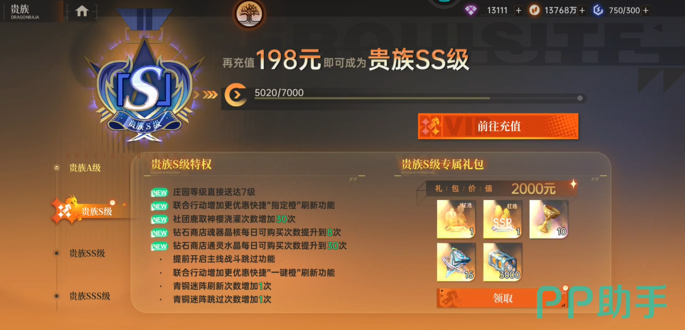 贵族S级与SS级奖励结构趋同,以进阶培养资源为核心,包括稀有装备强化石、角色突破卷轴及限时抽卡券等。虽具实用性,但尚未构成战力跃迁级增益。其中SS级需累计充值200元,属中高阶投入分水岭,是否选择需结合个人游戏时长预期与资源获取能力综合判断。
