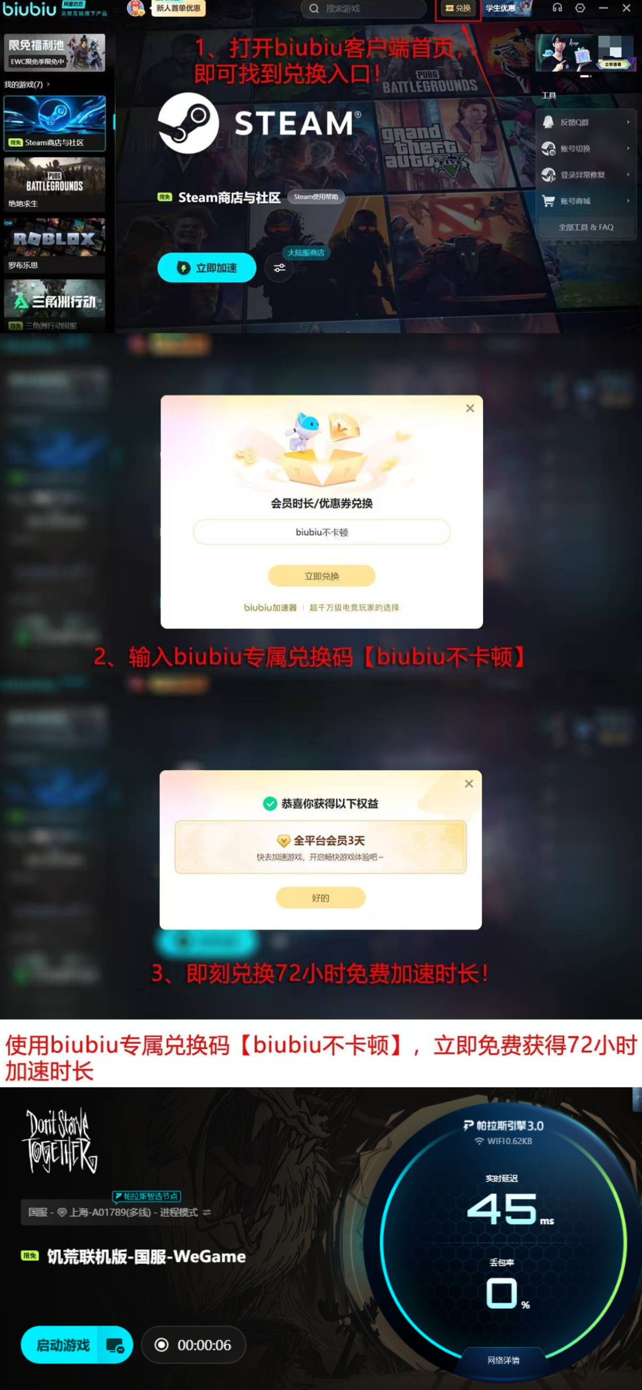 新用户首次注册即可自动获得24小时全功能试用权限,无需额外操作。此外,平台面向全体用户统一开放限时叠加权益:输入指定口令【biubiu不卡顿】,即可额外领取连续三日加速服务,新老用户各限领取一次,有效期自激活起实时计算。