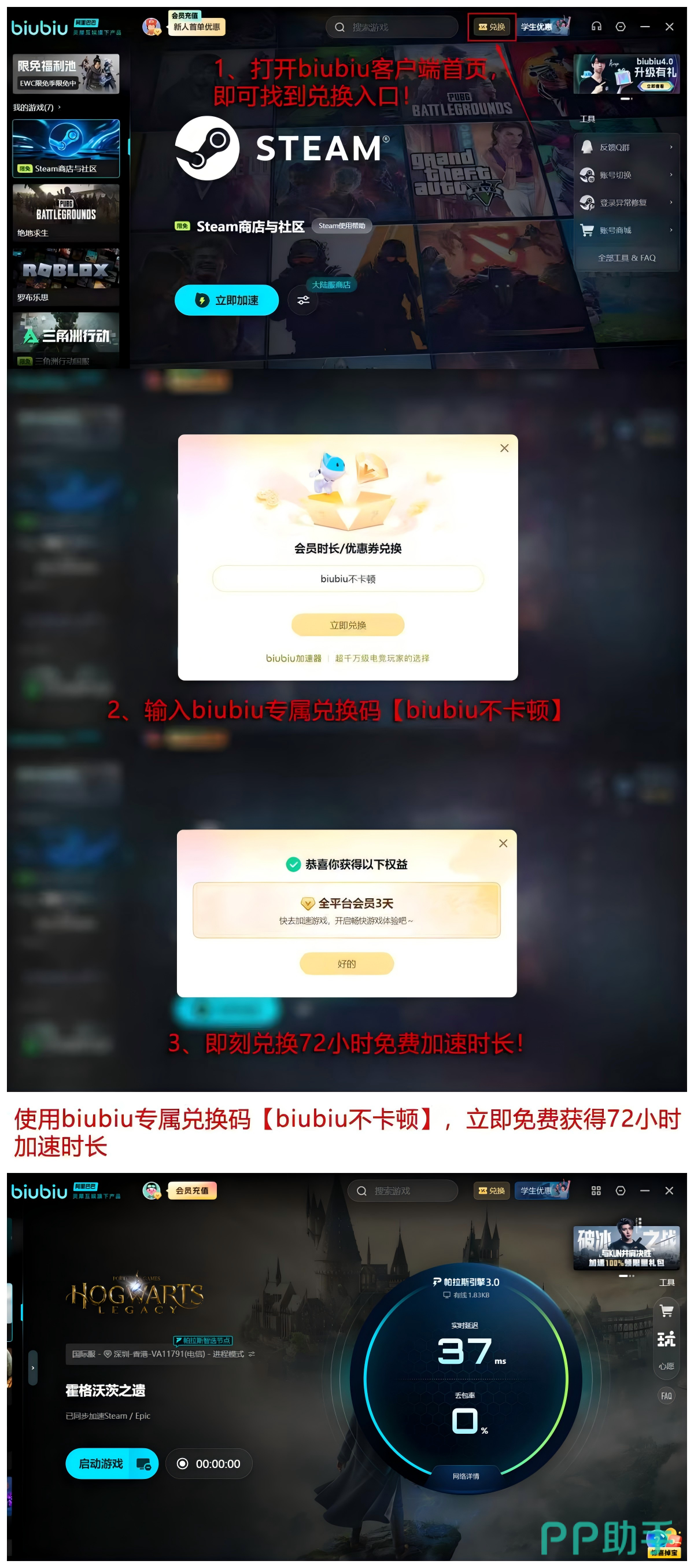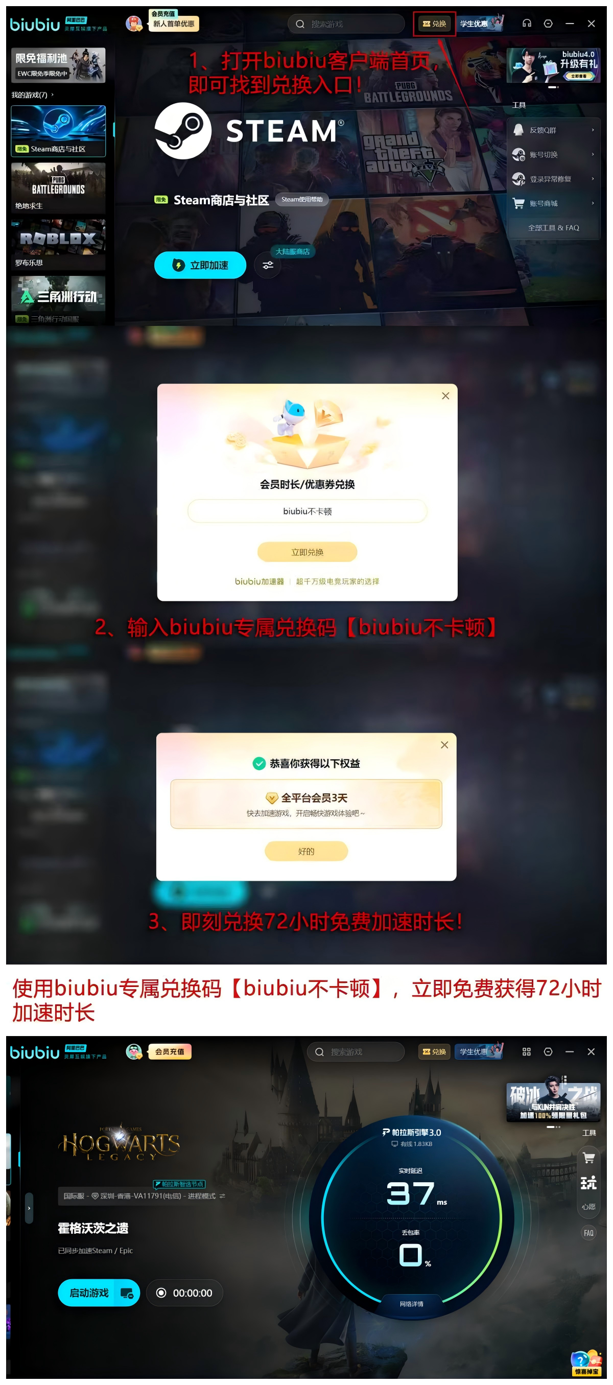 【biubiu不卡顿】激活口令有效期为72小时,新注册用户额外获赠24小时体验时长,累计可达96小时,支持先试用后开通,无强制订阅绑定,符合用户真实使用节奏与决策逻辑。