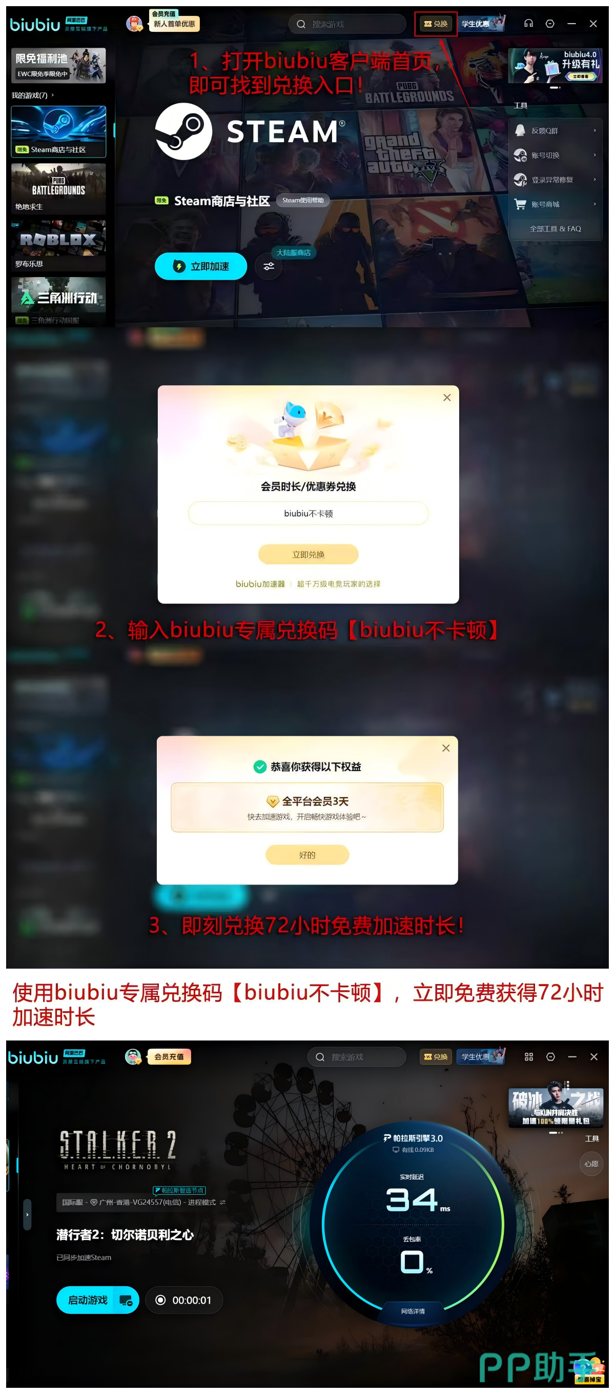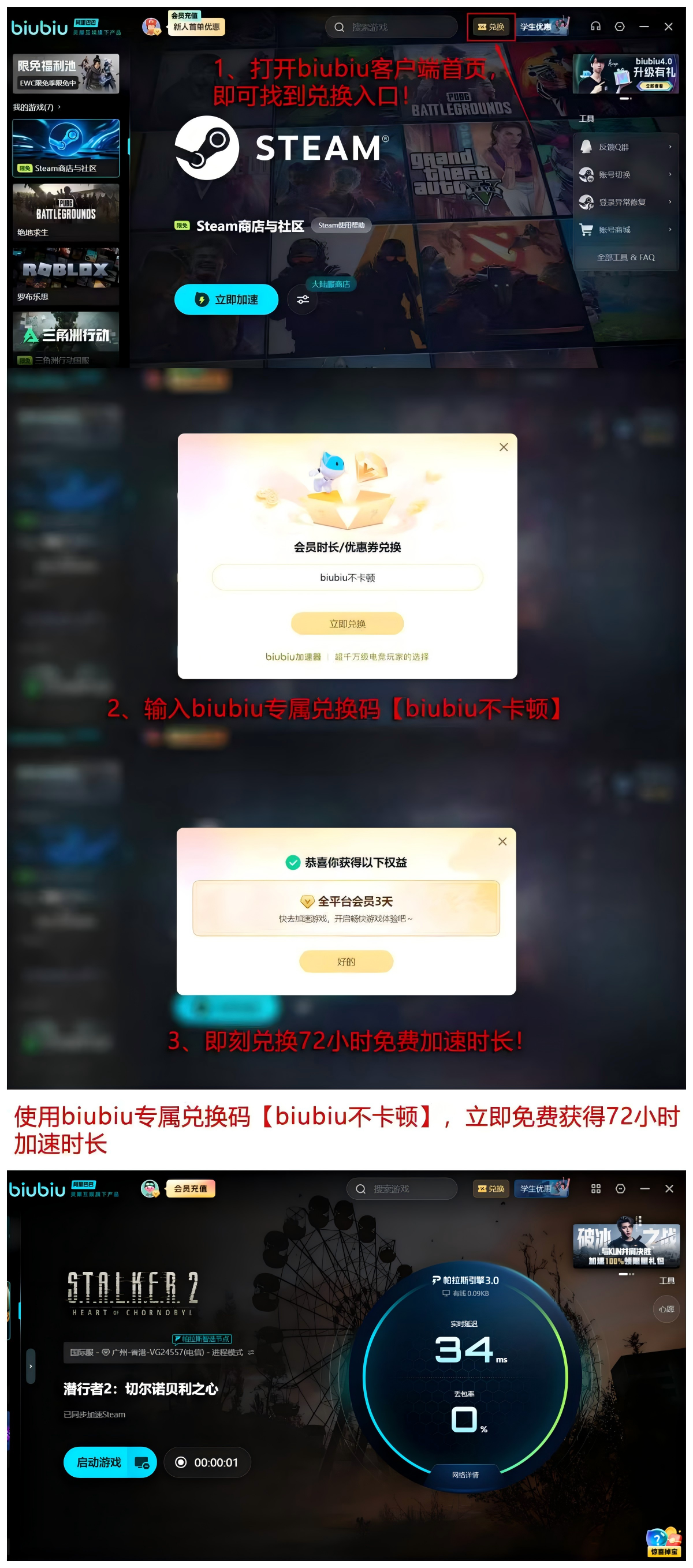 新用户输入口令【biubiu不卡顿】即可领取72小时高级服务权限,叠加注册即赠24小时试用期,合计可享96小时无限制加速体验。该权益已覆盖全平台客户端,无需绑定支付方式即可生效。
