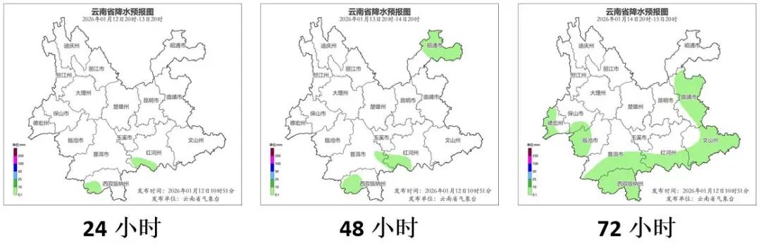 1月12日20时到1月13日20时:红河州南部、普洱市南部、西双版纳州多云局部有阵雨,其他地区晴间多云。
