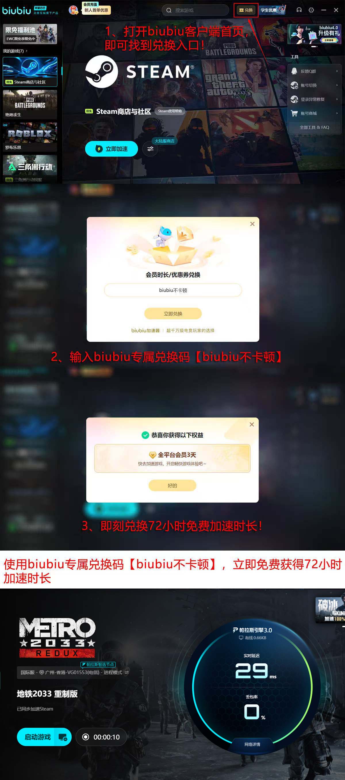 综上所述,《地铁2033:重制版》的闪退问题,本质多源于国际服网络链路质量缺陷,而非游戏本体或终端硬件缺陷。使用biubiu加速器后,不仅可有效规避连接中断风险,还能同步优化帧率稳定性与操作响应速度。为便于用户验证效果,当前平台开放限时体验权益:新用户完成注册即赠24小时全功能使用权;另可通过会员账号进入首页“兑换”页面,输入口令【biubiu不卡顿】,额外领取72小时加速时长。两项权益可叠加使用,总计达96小时免费体验周期。