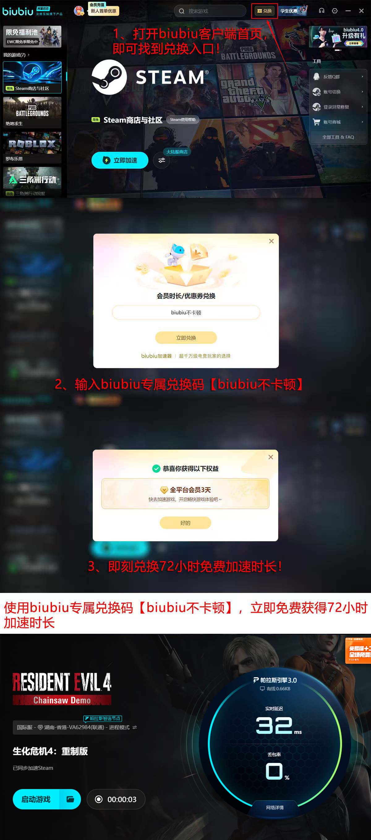 目前用户可通过官方渠道获取限时体验资格:完成新用户注册即可自动获得24小时免费加速时长;登录客户端后,进入首页点击“兑换”,在输入框中准确填写口令【biubiu不卡顿】,还可额外领取72小时加速权益。该方案无需更改系统设置,安装后一键启用,几分钟内即可完成部署,切实解决因网络层不稳定引发的各类运行异常。