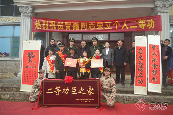 喜乐高奏,鞭炮齐鸣。在湖南娄底新化县,数百位乡亲簇拥在二等功臣曾鑫的家门口,见证荣耀时刻。送喜报分队与驻地县委领导、人武专干一道,郑重为二级上士曾鑫送去立功喜报及“二等功臣之家”牌匾。据悉,在2025年全军刺杀比武中,曾鑫凭借顽强拼搏的斗志,一路过关斩将,成功夺得双人对抗科目第六名的优异成绩,被表彰为“优秀个人”,年底因战备训练实绩突出荣立二等功。