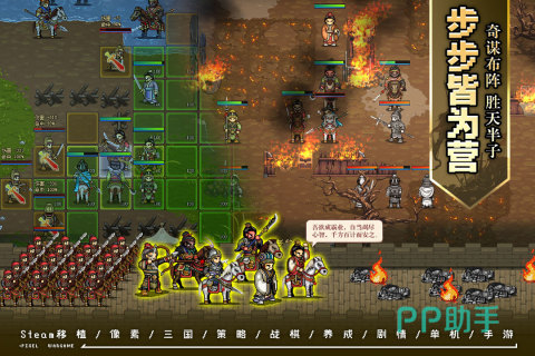 以三国历史为叙事基底的剧情向像素SLG。通过探索式关卡推进主线,逐步解锁关羽、周瑜、诸葛亮等关键人物。每个章节地图均配备独立环境机制:例如雪地降低移动力、密林遮蔽视野、城池提供守军增益。剧情在尊重史实框架基础上加入合理演绎,多周目章节设计深化角色动机与阵营矛盾,配合细腻像素场景构建,使每场战斗具备差异化解题路径。