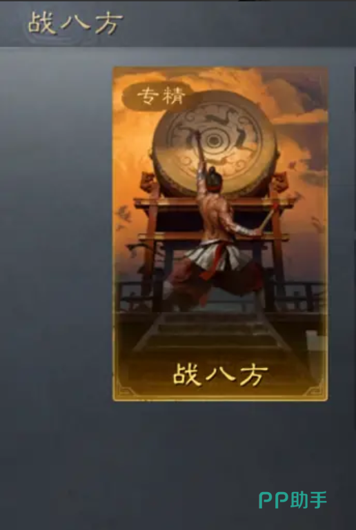 第二个“伐谋”,战斗开始前3轮,自身无法进行普攻,第4、6、8回合结束时,分别对敌军全体造成100%~200%,125%-250%,150%-300%谋略和兵刃伤害。第三个专属战法“专·战八方”,对敌方所有单位造成65%-130%谋略伤害,并施加持续2回合“畏惧”;