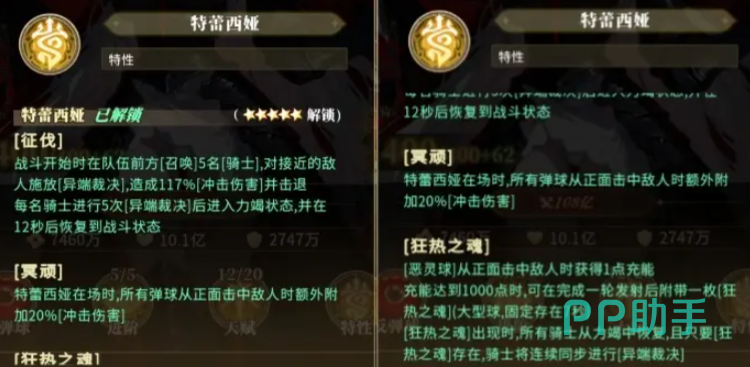 特蕾西娅有特殊的出伤机制,她的“征伐”会在战斗开始时在队伍前方召唤5位骑士,对接近的敌人施放裁决造成117%冲击伤害,进行5次裁决会力竭,等待12秒恢复到战斗状态,她的“冥顽”能在自身在场时,让所有弹球从正面击中敌人时额外附带20%冲击伤;