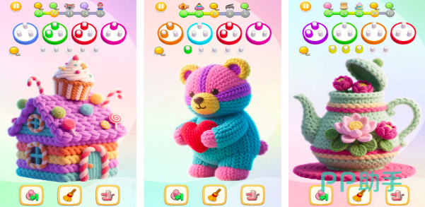 以毛线编织工艺为灵感核心,打造温暖柔软的手作氛围。玩家需通过匹配三色及以上同色毛线完成拆除任务,每次成功组合均可解锁新道具。游戏已上线超300个独立关卡,涵盖小熊、茶具等数十种手工造型模型;并配备三种主题辅助道具,显著提升通关流畅度与解压感。